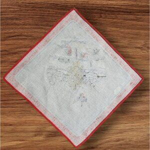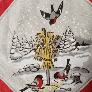 Vintage Swedish Doily. Bullfinch birds having a wheat sheaf treat in winter. Print on linen. Size is approximately 9in. x 9-3/8in. Pre-owned in very good condition. Beautiful as is or framed.