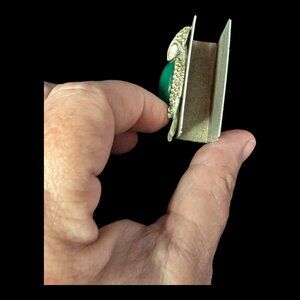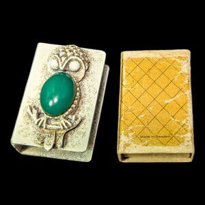 This enchanting matchbox holder, crafted in Sweden, features a charming owl design with a striking green gemstone inlay. A delightful piece for collectors, it adds a touch of whimsy and elegance to any space. The vintage appeal and intricate details make it a captivating treasure.