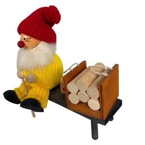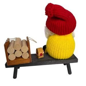 Add a touch of Scandinavian charm to your home with this vintage Swedish wooden gnome (Tomte) figurine. Handcrafted with traditional Nordic folk artistry, this delightful figure sits on a wooden bench beside a stack of firewood and a miniature lantern — ready to warm up any holiday display.