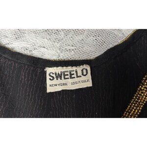 This vintage Swee Lo top showcases intricate hand-sewn sequins in a captivating butterfly design, blending pink, gold, and black hues. Made from 100% silk, it exudes timeless elegance and artistic craftsmanship. Its unique cape-like silhouette and shimmering details make it a standout piece for collectors or those who adore vintage charm.