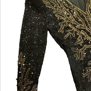 Vintage Swee Lo black and gold sparkling shimmery sequin evening gown w/ split