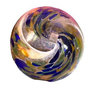 This vibrant hand-blown glass ornament adds a pop of color and artistry to any space. Its unique swirling patterns and bold tones make it a standout piece for both seasonal and everyday décor.