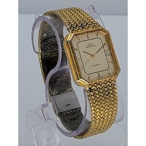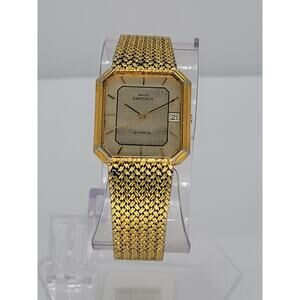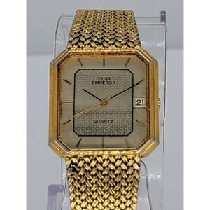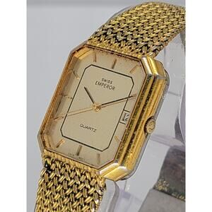 This classic Swiss Emperor quartz watch exudes vintage charm with its sleek, rectangular gold-tone case and matching gold mesh bracelet. The minimalistic dial features elegant stick markers and a date window at 3 o'clock, perfectly combining style and functionality. Its reliable quartz movement ensures accurate timekeeping, while the sophisticated design makes it a standout accessory for any collection. The watch is in excellent working condition, showing only minor signs of wear, which add character to its timeless look. Perfect for vintage watch enthusiasts or those looking to add a touch of sophistication to their wardrobe.