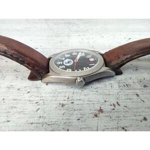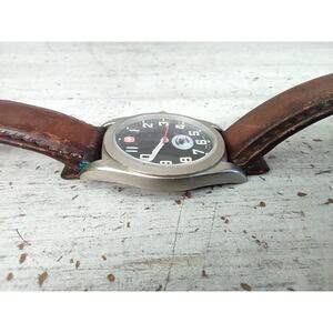 Used vintage condition with wear, scuffing, scratches, and metal discoloration. Watch has a dry battery and may require other repair in order to work. Part of the watch clasp is broken off and missing. Sold as is for parts or repair only. Entire piece, including band measures approximately 9 1/8" long, leather band measures approximately 0.75" wide, and watch face measures approximately 1 3/8" in diameter. See photos for more detail.