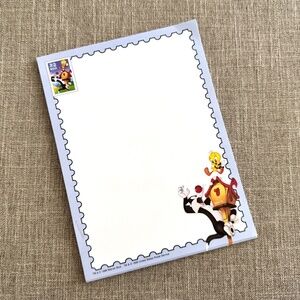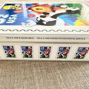 This vintage collectible set is from 1998 when the United States Postal Service released the Sylvester & Tweety Bird 32 cent stamp as part of the Warner Brothers Looney Tunes stamp collection. The stationery set is stored inside of a beautiful metal box that depicts the Sylvester & Tweety stamp.