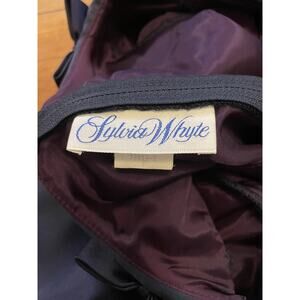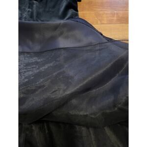Size 8. Measurements are 33.5” from shoulder to bottom, 13” pit to pit. Super stunning tea length dress. Navy velvet bodice with silky bow neckline. Silky circle skirt. Tulle lining. Cap sleeves. Back zipper closure with back belt.