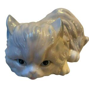 This vintage Syroco porcelain figurine captures the delicate charm of a Persian cat in a crouched pose. Its gray and blue glaze adds a timeless appeal, showcasing intricate detailing of the fur and expressive eyes. A collectible piece for cat enthusiasts or vintage décor lovers.