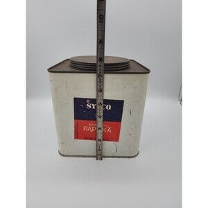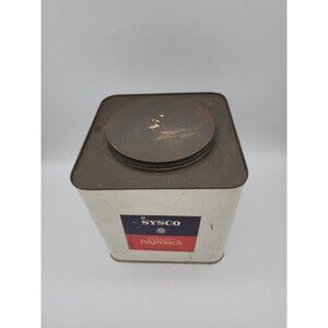 Vintage Sysco Spanish Paprika 96 Oz Large White Tin Houston Texas. This would be a great piece to decorate with. It has some rust, and scratches on paint. It has a rustic country vibe. See photos for condition. I believe this is a rare find. I could not find another one like it. It measures 7.5" x 7" x 7". This is an estate consignment item. Item is sold as is.