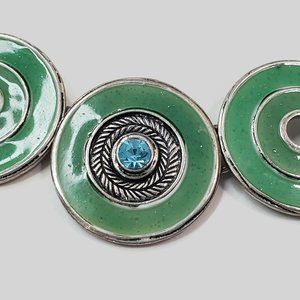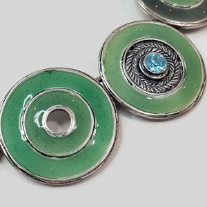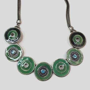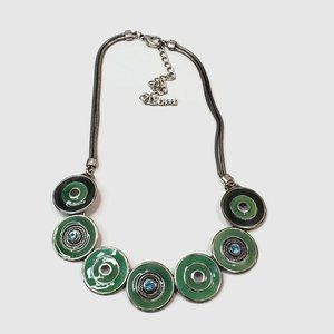 This is a vintage T Street Paris silver tone, green enamel and blue rhinestone necklace.