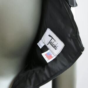 Vintage 80s Tadashi Black Sequin Evening Dress. Long sleeves and back zip. Sz 4. 100% Polyester. deep V front with center bad with interesting rouching effect.