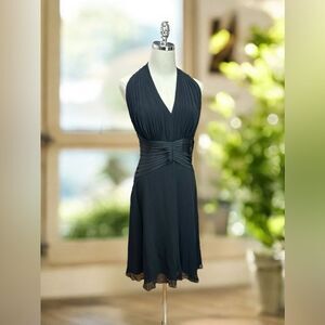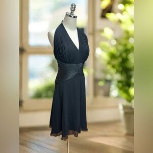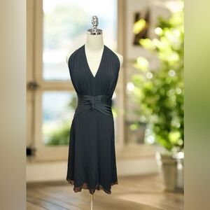 Classic Vintage 90s Halter Top Silk Cocktail Party Midi Dress by Tadashi Shoji Collection. Stunning and timeless; this dress is a head turner. Gathered Pleated Silk at the bust with satin, raw edge Satin pleats around the waist. Fit and flare, A-line skirt.