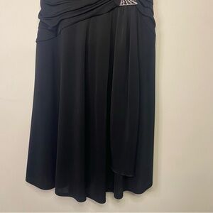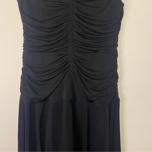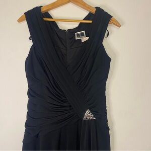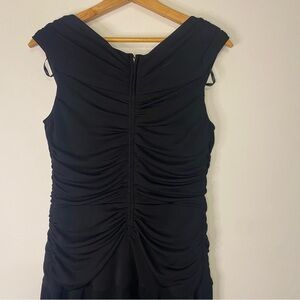 This elegant black sleeveless dress features a stylish ruched design, perfect for any occasion. The classic black color adds a touch of sophistication to your wardrobe. Vintage TADASHI Shoji formal black midi gown.