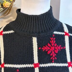 Vintage TALBOTS 100% Wool Embroidered Snowflakes Black & Red Oversized Sweater Sz PS