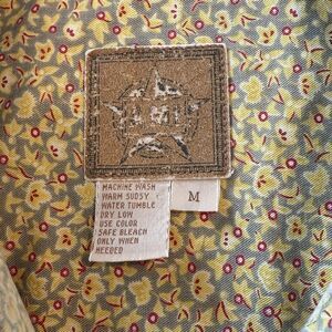 This vintage TAMI button-down shirt features a charming allover floral print with yellow and red flowers on a gray background. Made in Hong Kong of 100% cotton, it has a soft, lightweight feel perfect for casual or cottagecore styling. Long sleeves with button cuffs and a relaxed fit make it both comfortable and stylish.