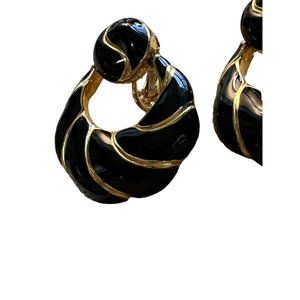 Vintage TAT Earrings Clip On Door Knocker Gold Tone Black Enamel 1.5"