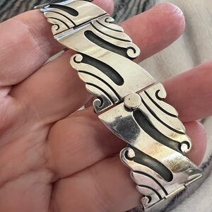 For your consideration is this vintage Taxco bracelet, specifically identified as being marked "AVG Mexico Sterling," indicating its silver content and maker. This bracelet measures 7.5 inches in length and has a substantial weight of 40.3 grams. It is a heavy solid construction typical of quality vintage jewelry. The design features a series of interlocking, stylized links with a distinctive wavy or scroll-like pattern, characteristic of the artistic silverwork often found in Taxco, Mexico.
