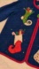 Vintage Tiara International Christmas Collection sweater in royal blue with red trim. Zip-front closure with holly zipper pulls, sequins, beads, and festive appliqué Christmas stockings filled with presents. A rare collectible piece, perfect for holiday parties, Christmas events, or Ugly Sweater contests that actually win.