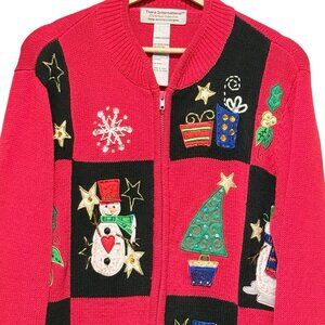This Vintage TIARA Women's Ugly Christmas Patchwork Cardigan Sweater is perfect for the holiday season, featuring a festive holiday snowmen and trees pattern with accents of beaded and embroidered details. The tight-knit sweater in red with long sleeves and a high neck offers a cozy and whimsical fit for Christmas Eve celebrations or holiday parties. Accents of Christmas trees, presents, snowflakes and snowmen. Made from a blend of ramie and cotton, this vintage sweater from Tiara International brings a touch of nostalgia to your winter wardrobe, making it a fun and stylish addition to your festive outfit. Please note that the image with the model is an AI image and is only for reference. The item may not be exactly as shown.