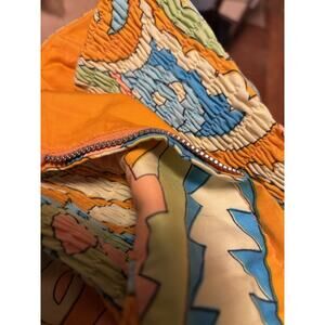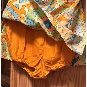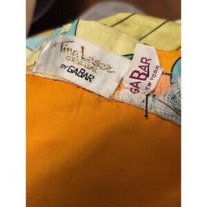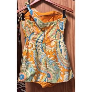 The Vintage Tina Leser Original by Gabar one shoulder swimsuit is a stylish and unique piece from the 1950s. Made of cotton with a vibrant orange, turquoise, yellow, and green color palette, this swimsuit features a flattering one-shoulder design. With a chest size of 30”, a waist to hem length of 13", and a shoulder to hem length of 20", this original piece is a perfect addition to any vintage clothing collection. As can be seen in photos, #3 & 7, the suit has elastic on the upper sides, making the chest size somewhat expandable. Made in the United States, this swimsuit offers a touch of retro glamour for those who appreciate timeless fashion.