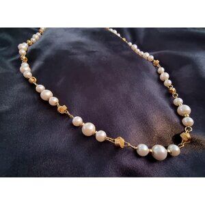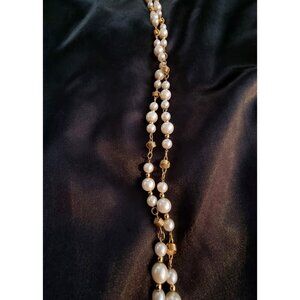 Vintage TRIFARI 1990s Faux Pearl Gold Tone Filigree Link Long Strand Necklace