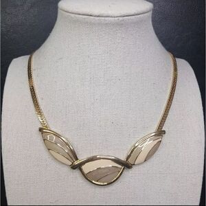 The vintage TRIFARI bib necklace you have showcased is a masterpiece of timeless elegance and exquisite craftsmanship. Featuring a luxurious combination of creamy beige enamel and polished gold-tone accents, the necklace boasts a sleek and sculptural design with three distinct, leaf-like motifs linked seamlessly along a smooth, gold-tone chain.