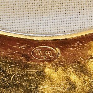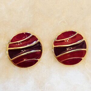 Vintage TRIFARI Cranberry Red & Plum Chevron Necklace & Matching Earrings set. Necklace is approximately 17" long and features a center chevron-styled medallion with vibrant multicolor enamel accents. The earrings measure approximately 1" in diameter. The set is signed by the renowned brand Trifari. This statement jewelry set is perfect for those who appreciate vintage pieces, adding a unique and eye-catching touch to any outfit.