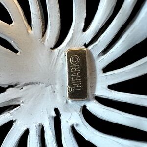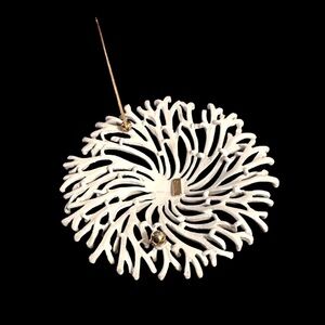 This exquisite Trifari brooch captures the essence of a coral formation with its intricate, flowing design. The pure white color against a contrasting background highlights the delicate, tentacle-like extensions that radiate from the center, creating a mesmerizing visual effect. Perfect for adding a touch of elegance and dynamic motion to any outfit.