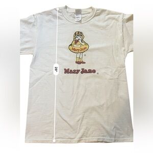 The Vintage Mary Jane Candy Necco Men's T-Shirt in size M is a 100% cotton white shirt with a crew neck and short sleeves, perfect for fans of the Mary Jane character. Made in Haiti in the 1990s, this Gildan brand shirt features a regular fit and is handmade, making it a unique addition to any vintage collection. The shirt is a representation of nostalgia and a love for classic candies and characters from the past.