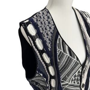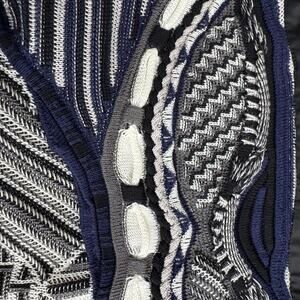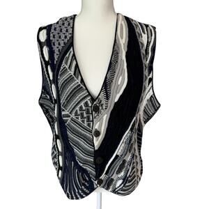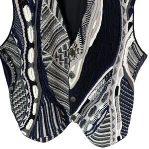 Elevate your style game with this vintage 3D textured knit sweater vest from Tundra Canada. Inspired by the iconic Coogi brand, this vest features a colorful geometric pattern, button front closure. Metal buttons with "T" logo. The heavyweight cotton material is perfect for winter, fall, and spring seasons, making it suitable for both casual and party/cocktail occasions.