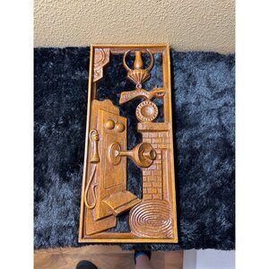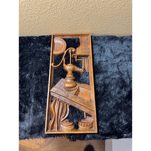This intricately carved wood wall art showcases a vintage water pump and barrel scene. Its detailed craftsmanship and classic design make it an appealing decor piece for homes or offices. The rich wood tones add warmth, while the relief carving offers a touch of elegance and nostalgia.