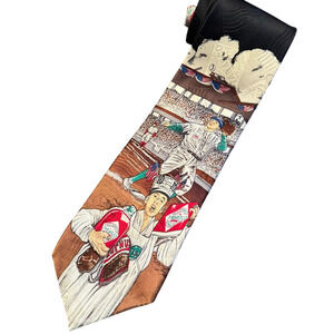 Vintage Tabasco novelty tie – 100% silk, made in USA. Baseball stadium design with bold graphics, oversized Tabasco bottles + player artwork. Perfect statement tie for sports fans, hot sauce lovers, or collectors of quirky vintage.