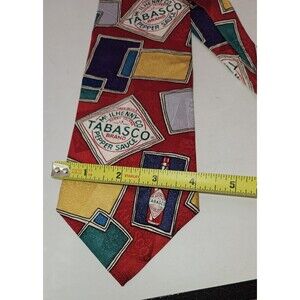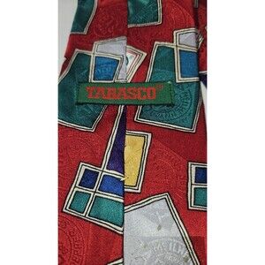Spice up your wardrobe with this vintage Tabasco tie from McILHENNY. Made with 100% imported silk and expertly crafted in the USA, this designer tie features a bold geometric pattern in red and blue that is sure to turn heads. Perfect for men who appreciate unique style, this tie is a must-have for any food and drink enthusiast. The classic width and high-quality fabric make it a versatile accessory that can elevate any outfit. Add a touch of heat to your wardrobe with this one-of-a-kind Tabasco tie.