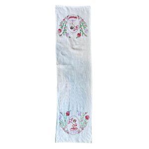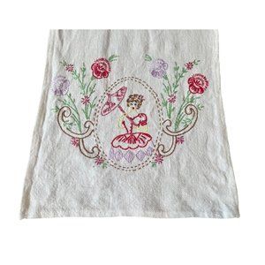 Vintage Table Runner Hand Embroidered Girl with Umbrella & Flowers decor 40" .