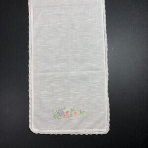Vintage Table Runner Hand Embroidered Pink and Blue Flowers Crochet Edge 40"x12”