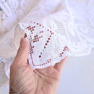 Pretty vintage ivory lace rectangular table topper. Edges are gently scalloped. I believe this is circa 1960s or so but not sure. Measures approx. 31" long by 13.5" wide.