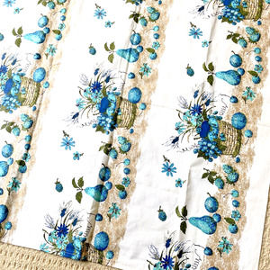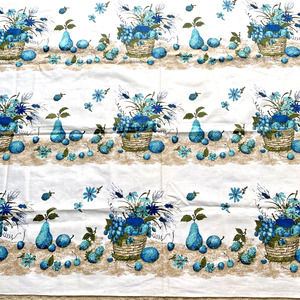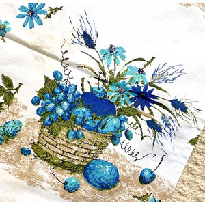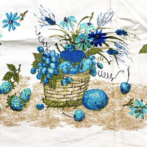 Vintage Cotton Tablecloth in a colorful 1970’s fruit baskets print. The printed pattern is in aqua blue & tan colors on white background and runs the long length of the cloth - appears to be a handmade cloth using standard width fabric. The result is a unique cloth perfect for a picnic table or buffet cover. There are a few very light stains (see pics) but overall this cloth is in very good condition with no damage or flaws. Just stunningly brilliant colors on a cloth to use or repurpose at your whim.