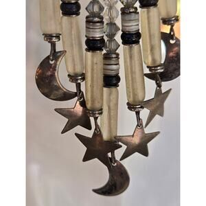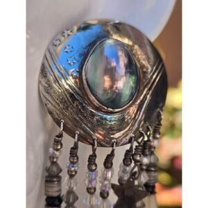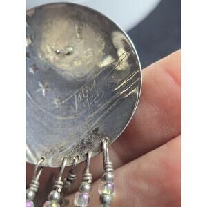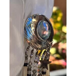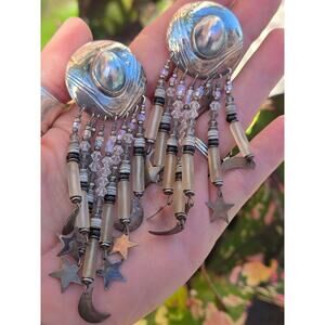 From the large engraved sterling silver round tops, the blue/gray iridescent pearl cabochons, the tubular and iridescent crystal beaded strands that adorn sterling silver moon and starts, these gorgeous statement earrings will NOT disappoint!