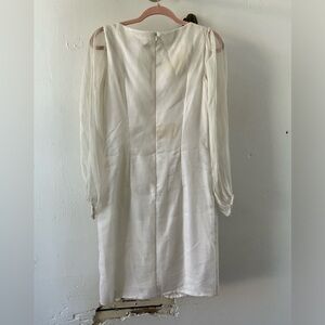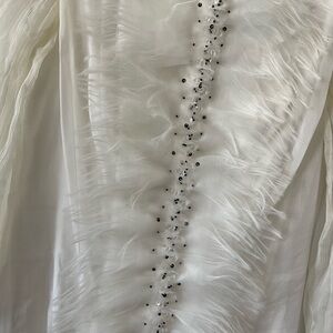 Good vintage condition. Size 6. Sheer sleeves, sequins and feather detail down front length of dress. Stain on back shown in picture, needs a good dry cleaning. Beautiful dress!