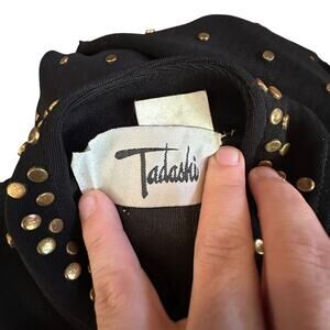 Vintage Tadashi Shoji Studded Jacket Black Gold Womens l Measurements approximate and on flat surface: P2P: 16", Length: 27" l Tag is hanging on by a thread :P l Gorgeous 1990s Tadashi gold studded jacket. 79% Polyester 21% Lycra. Very thick and stretchy material. Two faux pockets on the front zippers open to inside of jacket. Two thin shoulder pads.