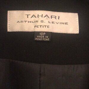 Step into timeless sophistication with this Tahari Arthur S. Levine petite two-piece set, featuring a tailored blazer and matching tank top. The crisp white ribbon trim contrasts beautifully against the rich black fabric — perfect for polished professional looks or elegant evening wear.