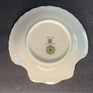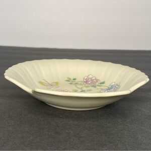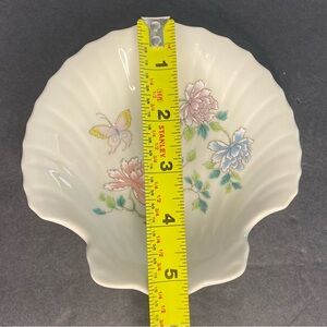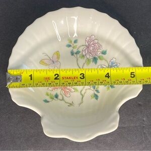 This seashell designed plate is a perfect dish for trinkets, spare change or even a spoon rest in the kitchen. It has a floral design and butterfly with a crimping look of a seashell around the edges. This measures 5.25”x5.25”