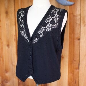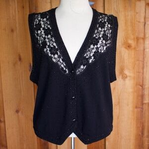 Vintage Talbots 100% Wool Beaded & Lace Knitted Black Button Down Vest Size L