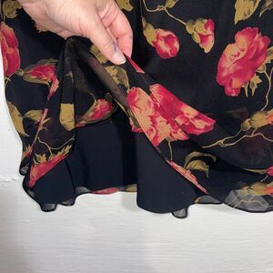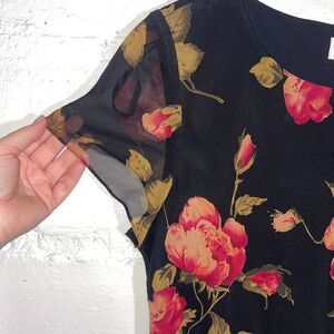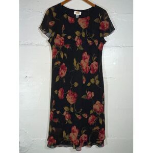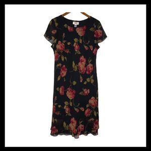 Keywords: vintage Talbots dress, silk floral dress, black red sheath, 90s midi dress, Talbots 16 petite, cocktail dress, elegant floral silk dress, evening, bias cut