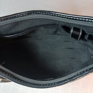 Vintage woven Talbots shoulder bag with Patent Leather straps, side detail and trim. Bamboo, studded metal and leather tassels on main zipper. This bag is in excellent pre-owned condition.