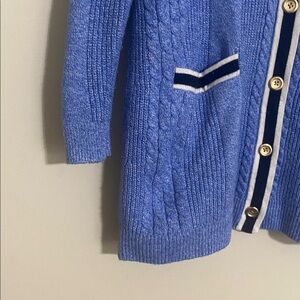 Elegant blue knit cardigan with white accents. Perfect for layering.