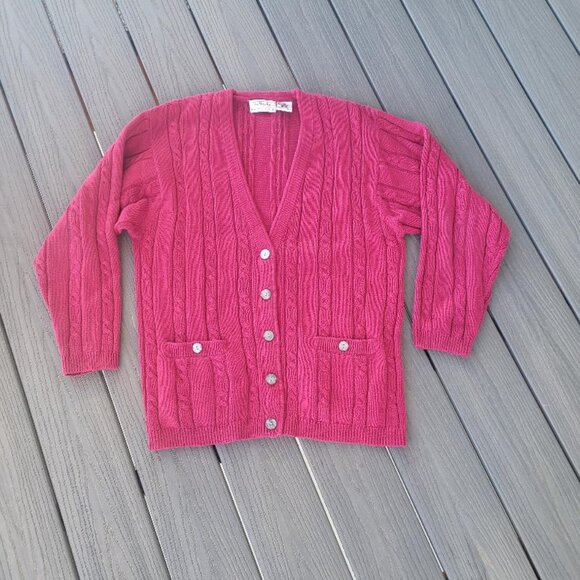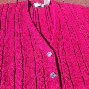 This is a vintage, raspberry colored Talbot's cardigan in a petite large. It's a pre-owned sweater from my personal closet. It is in good condition with no holes, stains or snags. Measurements and fabric content/care are included in the pictures.