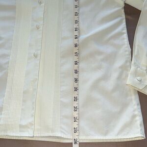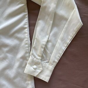 Classic and versatile creamy ivory button-up blouse. Crafted with quality and attention to detail, this shirt features elegant pin-tuck pleats running down the front, adding a sophisticated touch. The long sleeves and collared design make it perfect for both professional settings and dressed-up casual occasions. The buttons are covered in fabric!