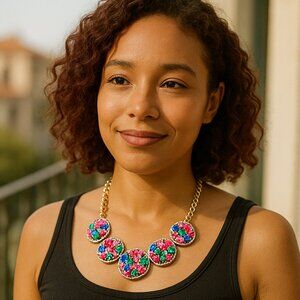 Step back in time with this stunning new with tags statement necklace from Talbots! Bursting with vibrant colors & playful floral designs, this necklace is a true showstopper. Crafted with high-quality materials, it exudes elegance and timeless charm. This piece is sure to elevate any outfit & make a statement wherever you go.