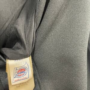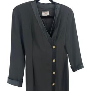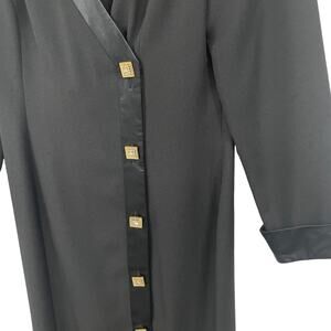 • Features: 3/4 length sleeves, Black fabric with contrasting silky trim on neckline and sleeves, Gold embellished rhinestone buttons, Union made, Lined, Button up closure, Shoulder pads