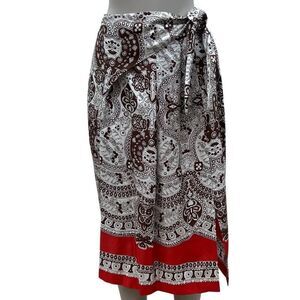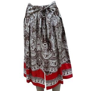 This A-line bohemian skirt is crafted from 100% silk, featuring an elegant white and brown paisley print with a vibrant pop of red along the hem. A bold red border adds an extra touch of color. Designed with a unique faux-wrap silhouette, the skirt includes two bat-wing panels that tie at the sides, creating a stylish wrap effect. A hidden rear zipper closure ensures a seamless fit.